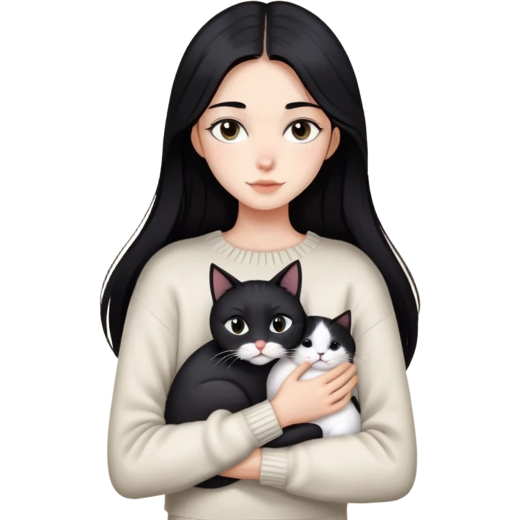 Beautiful skinny woman long dark black hair in sweater hug black white cat emoji | AI Emoji Generator