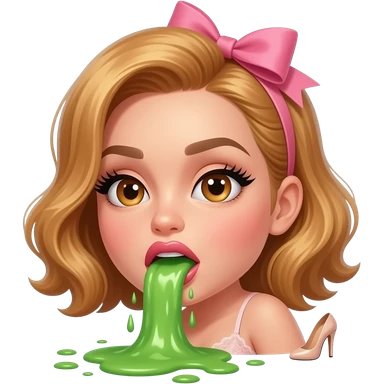 Beautiful green eyed model with brown hair, beige skin, with a wine, with a makeup emoji