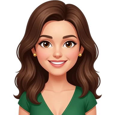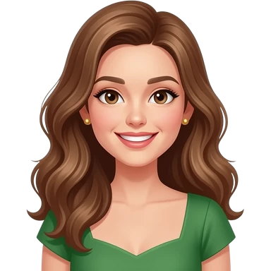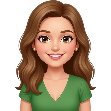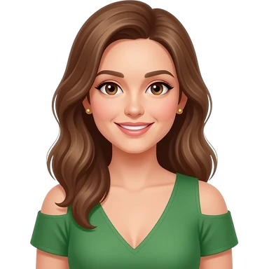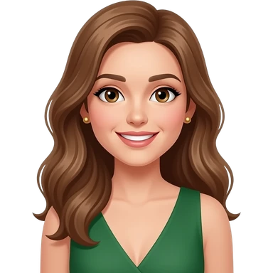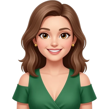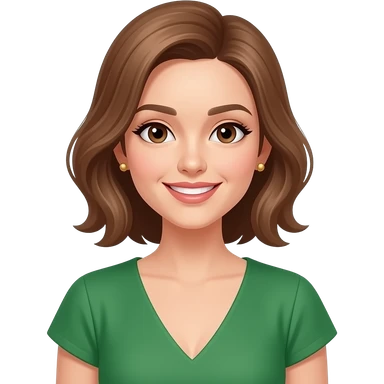 beauty, woman, gold stud earrings, brown eyes, green v dress with shoulders, smiling, light brown hair, hairstyle emoji
