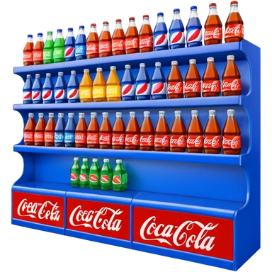 3D warehouse shelf with Coca-Cola, Pepsi, Fanta bottles and products, organized retail shelves, colorful product packages, store inventory, transparent background, emoji style, realistic, isometric view emoji