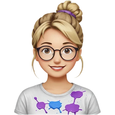 Artist Woman – messy bun, round glasses, paint stains on shirt. emoji