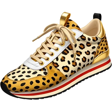 Realistic, isolated, side view, womens trendy cheetah print sneaker, with gold elements, undone laces, ultra detailed shoe emoji