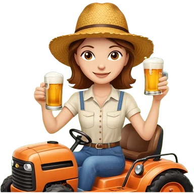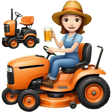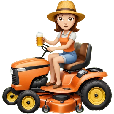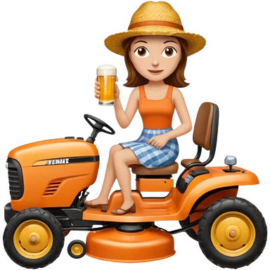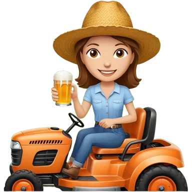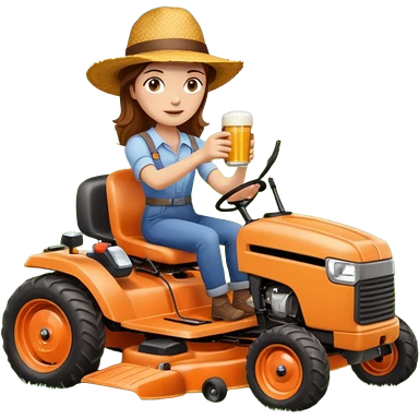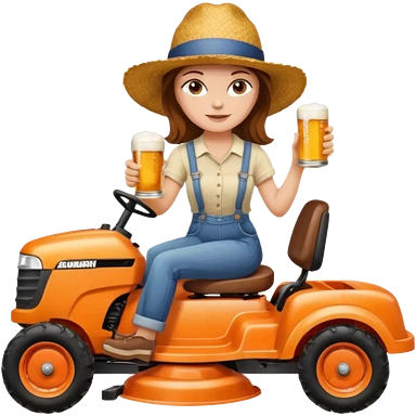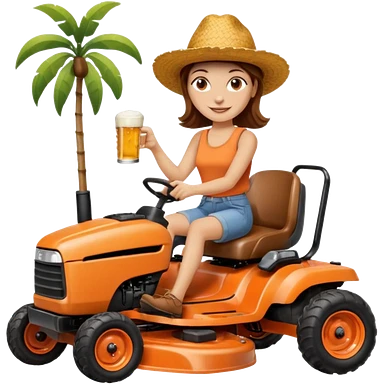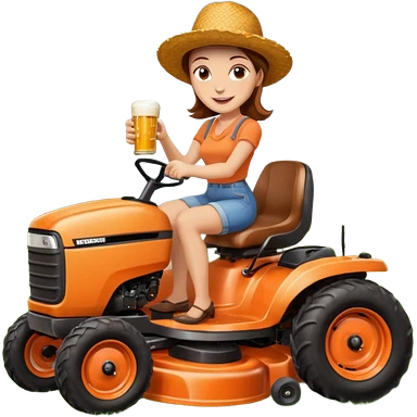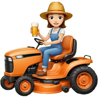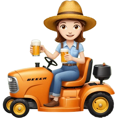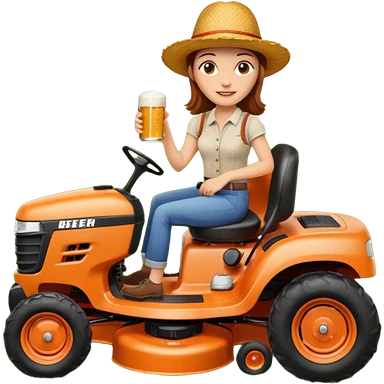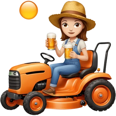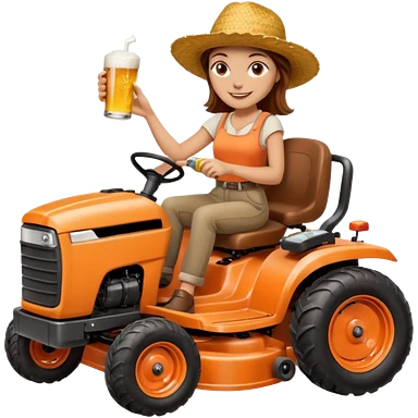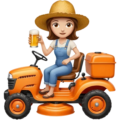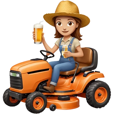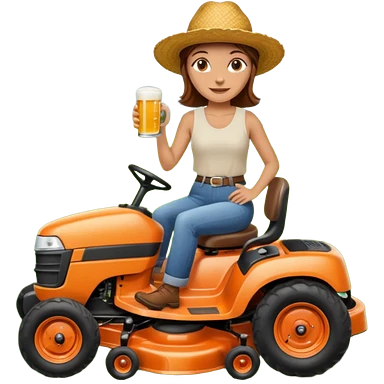 White woman with brown hair, without glasses wearing a straw hat, on old orange ride on lawn mower, holding a beer with one hand and holding the steering wheel with the other hand emoji