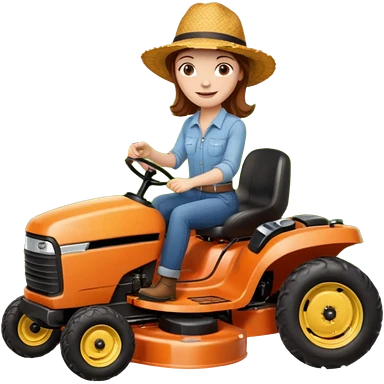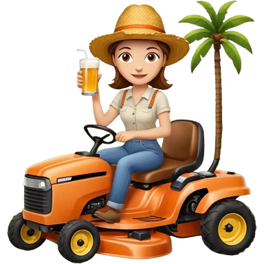 White woman with brown hair, without glasses wearing a straw hat, on old orange ride on lawn mower, holding a beer emoji