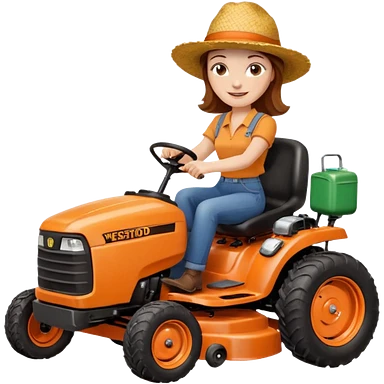 White woman with brown hair, without glasses wearing a straw hat, on old orange ride on lawn mower, holding a beer with one hand and holding the steering wheel with the other hand. Woman is smiling. Lawn mower brand is called “Westwood” emoji