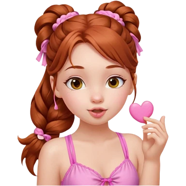 A cute ukrainian girl, with long auburn hair two side ponytails plaited, in her pink bathing costume, she's blowing a kiss. emoji