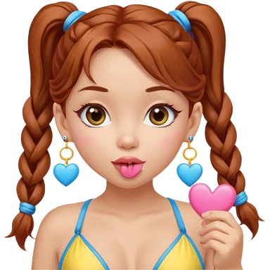A cute ukrainian girl, looks slightly malaisain with full lips and long auburn hair in two plaited ponytails, has heart earrings in yellow and blue, and is wearing her pink bikini, she is blowing a kiss. emoji