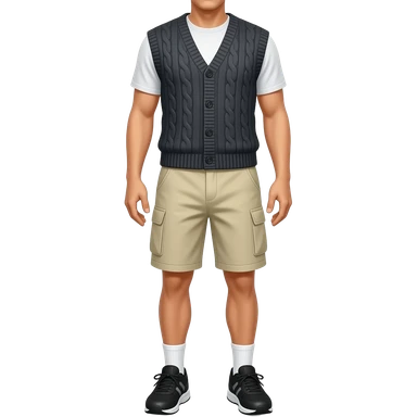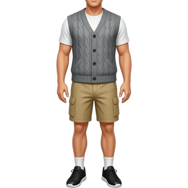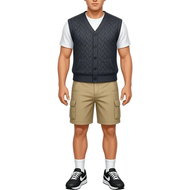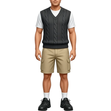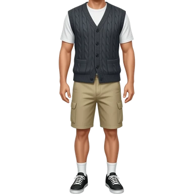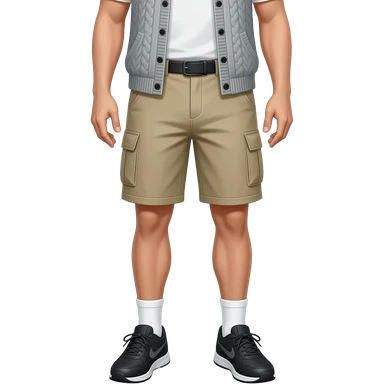black running shoes, bare legs, beige cargo shorts and a sweatervest from the waist down emoji