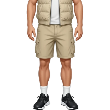 black running shoes with white socks, bare legs, beige cargo shorts and a dark grey open sweatervest from the waist down emoji