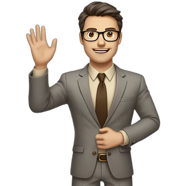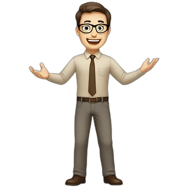 To belt Actively gesturing with hands Pale skinned fit man with dark brown hair in gray jacket, beige office shirt, brown tie, brown pants and vintage glasses. emoji