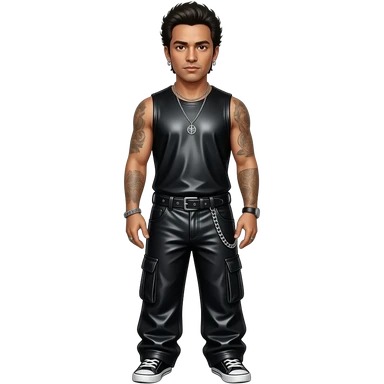 James Hetfield with black metallic sleeveless shirt, black metallic baggy wide leg pants with chain, necklace emoji