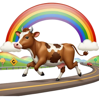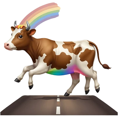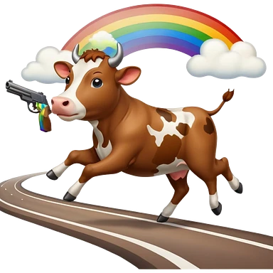 a cow running across a highway on a rainbow shooting a gun emoji