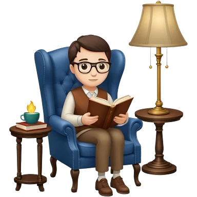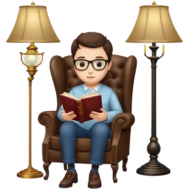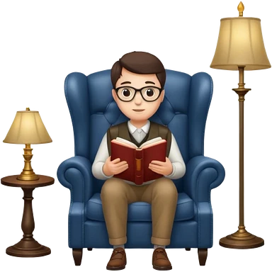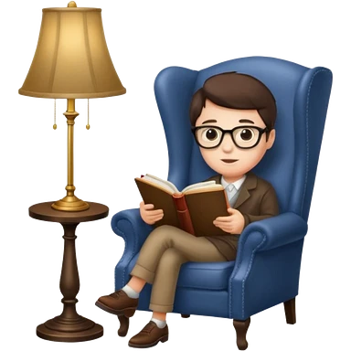 peruse at your leisure, person reading with small glasses in a wingback chair next to a lamp emoji