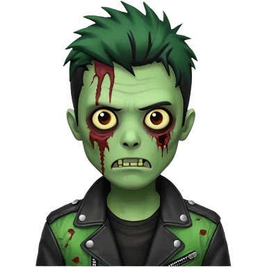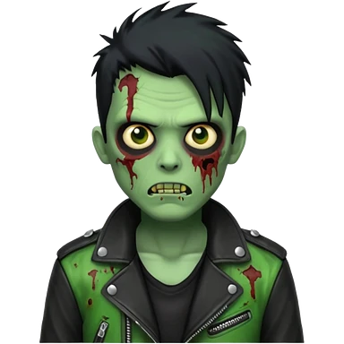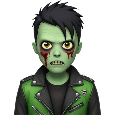 Hombre zombie de piel verde con chaqueta de cuero punk, pelo negro emoji