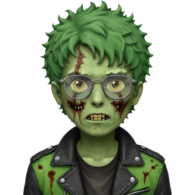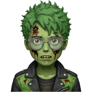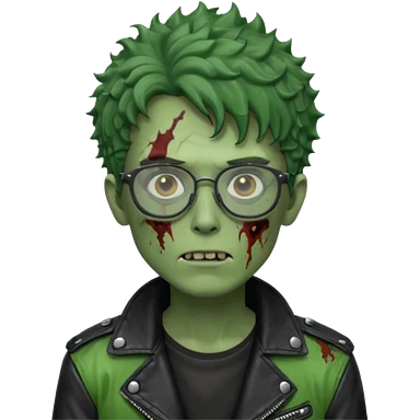 Hombre zombie de piel verde con chaqueta de cuero punk, pelo rizado corto y gafas emoji