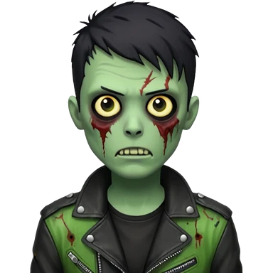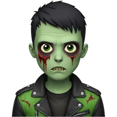 Hombre zombie de piel verde con chaqueta de cuero punk, pelo corto negro emoji