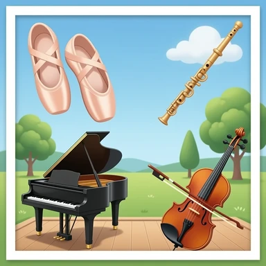 Stage (ballet), ballet slippers, piano, flute, and violin emoji