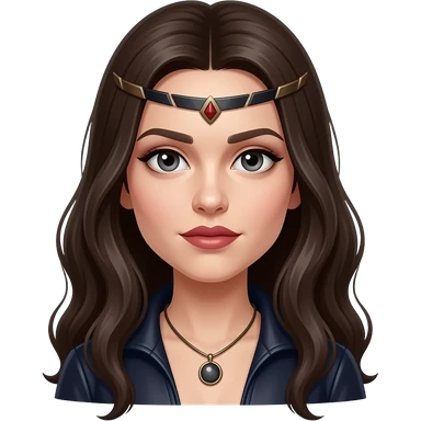 Bellatrix Lestrange emoji, adult woman, very pale skin, wild tangled long black hair with messy volume and curls, sharp cheekbones, dark sunken eyes, intense manic gaze, slightly crooked smile, gothic dark dress, chaotic energy, minimal icon, centered, white background, high detail emoji | AI Emoji Generator