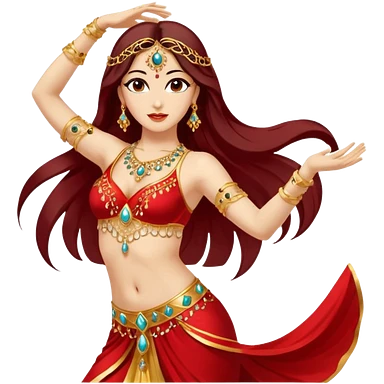 Elegant belly dancer emoji, mid-movement, wearing red and gold costume, one arm raised, flowing hair, minimal vector style, expressive and clear, transparent background. emoji