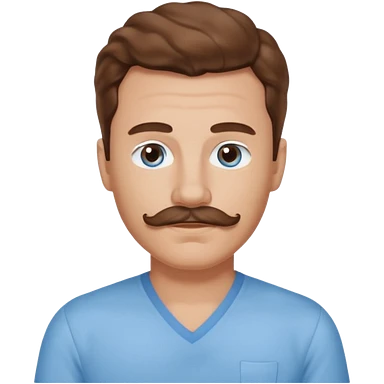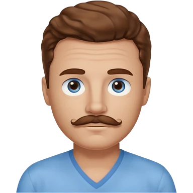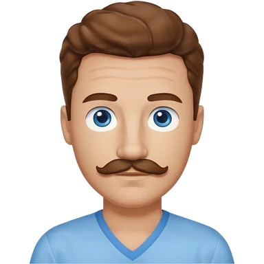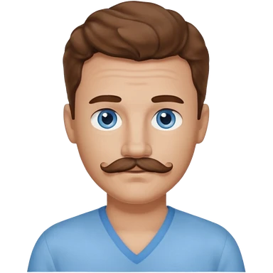 Benson Boone blue eyes, brown wavy hair and mustache, light blue v-neck shirt emoji
