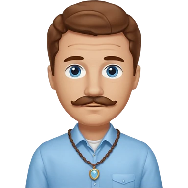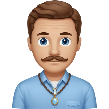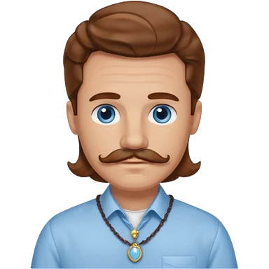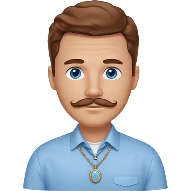 Benson Boone blue eyes, brown wavy hair and mustache, light blue dress shirt with necklace emoji