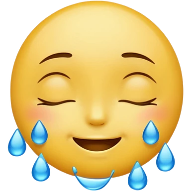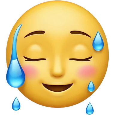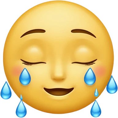 Эмодзи слёзы радости. Жёлтый круглый эмодзи с закрытыми глазами и мягкой улыбкой—из-под каждого глаза текут две широкие, ярко-голубые слезы. Глянцевый, 3D стиль эмодзи emoji
