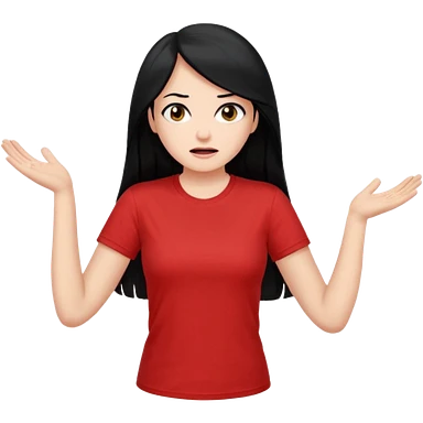 빨간색 티셔츠를 입고 긴 검정머리를 가진 여성이 모르겠다는 듯이 어깨를 올리고 고개를 갸우뚱한 제스처를 하고있음 🤷🏻♀️ emoji