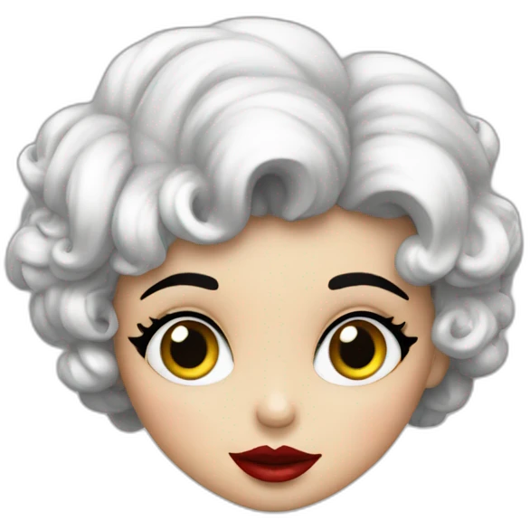Betty Boop: round face, honey-toned skin, expressive eyes, full eyelashes, arched eyebrows, tiny upturned nose, pouty puckered lips, matching lipstick, flawless makeup, black long wavy hair that elegant frame her face in a high side ponytail, nails, laughing emoji