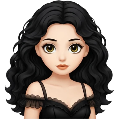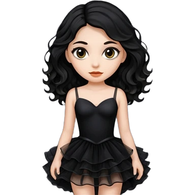Beyaz tenli siyah tül çok açık elbise giyen siyah dalgalı saçı olan çekik gözlü emoji