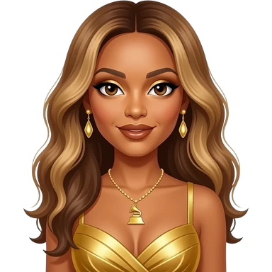 Beyonce from Destiny's Child with brown eyes, long light brown hair with blonde highlights, gold eyeshadow, brown lipstick, gold grammy dress, necklace and earrings emoji