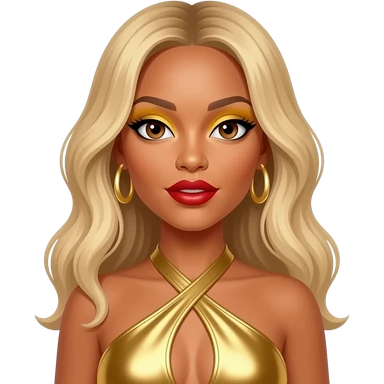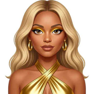 Beyonce with hazel eyes, long blonde hair, gold dress, gold earrings emoji