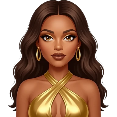 Beyonce with hazel eyes, long dark brown hair, gold eyeshadow, dark bronze lipstick, gold metallic halter dress, gold earrings emoji