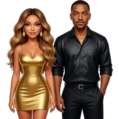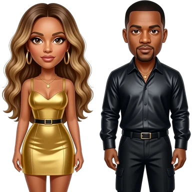 Beyonce with hazel eyes, long golden brown hair, gold short dress, gold earrings, Jay-Z with dark brown eyes, black hair, black metallic shirt and baggy pants, necklace emoji