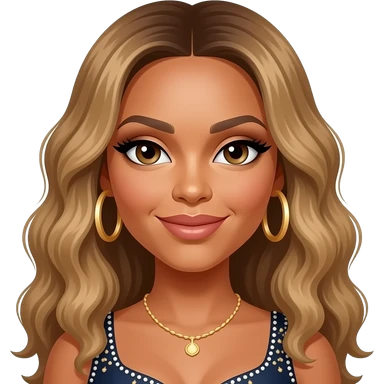Beyonce with hazel eyes, long golden brown hair with blonde highlights, gold metallic sleeveless sweetheart crop top, gold metallic long skirt, necklace and earrings emoji