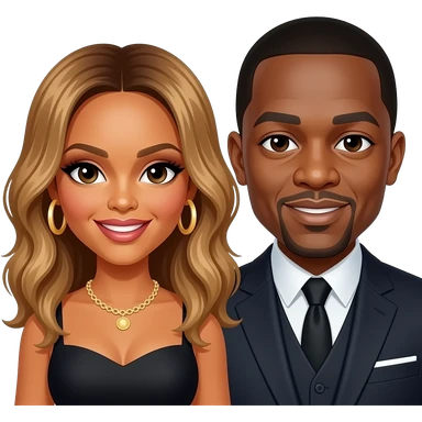 Beyonce with hazel eyes, long golden brown hair, gold short dress, gold earrings, Jay-Z with dark brown eyes, black hair, black metallic shirt and baggy pants, necklace emoji