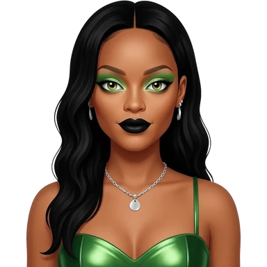 Rihanna with hazel green eyes, long black hair, light green eyeshadow, black lipstick, green metallic sweetheart dress, silver necklace and earrings emoji