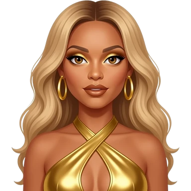 Beyonce with hazel brown eyes, long blonde hair, gold eyeshadow, gold lipstick, gold metallic sweetheart dress, gold necklace and earrings emoji