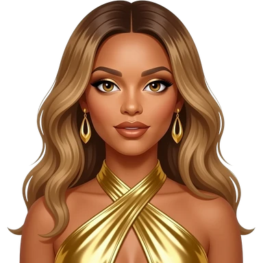 Beyonce from Destiny's Child with hazel eyes, long golden brown hair, gold eyeshadow, bronze lipstick, gold metallic halter dress, gold earrings emoji