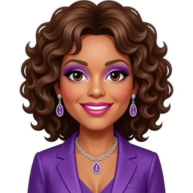 Whitney Houston with dark brown eyes, brown curly hair, purple eyeshadow, hot pink lipstick, purple pop idol outfit, necklace and earrings emoji