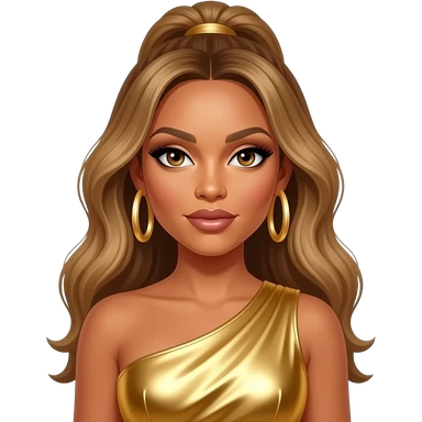 Beyonce with hazel eyes, long golden brown hair with blonde highlights, gold metallic sleeveless sweetheart crop top, gold metallic long skirt, necklace and earrings emoji