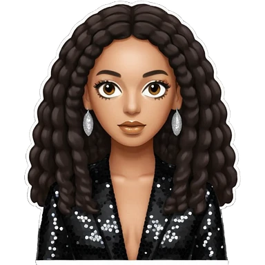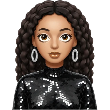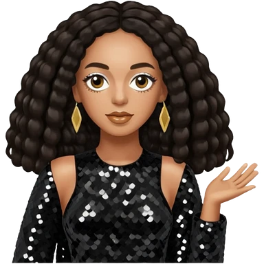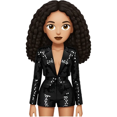 Solange with long dark brown hair, black sequin tour outfit emoji