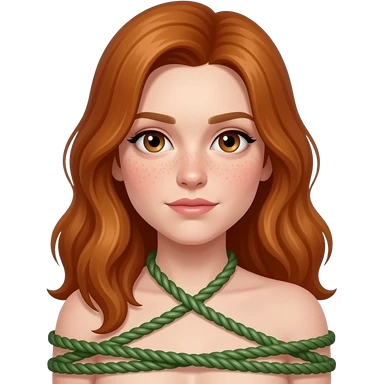 Light skin with freckles, long red hair, hazel eyes submissive, bound in green rope emoji