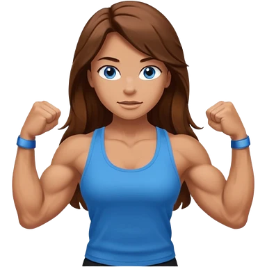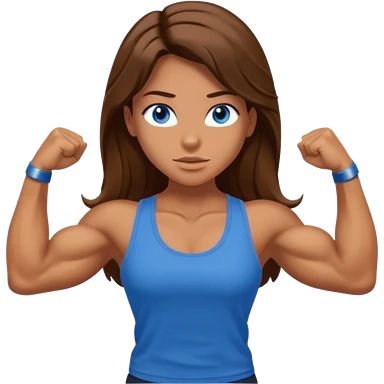 Girl with long brown hair, blue eyes and really muscular arms, flexing her muscles. Wearing a tank top emoji