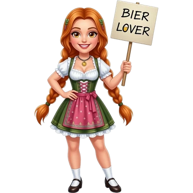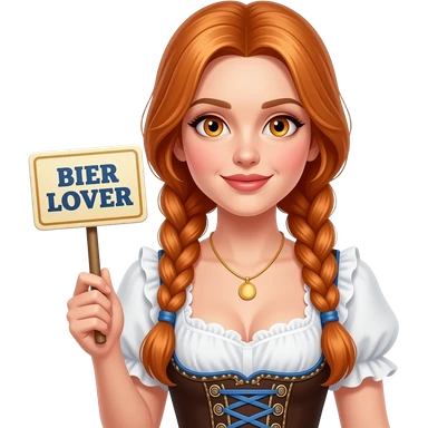 sexy girl with overlong ginger hair in braids and ginger eyes wearing a dirndl holding a BIER LOVER sign emoji