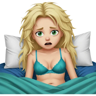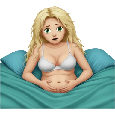 Blonde baddie with very long messi hair blue-green eyes and lay in a big bed in underwear sie hat Todesangst und guckt schmerzhaft und erschrocken ihr Bauch ist dick und ihre Unterhose blutet emoji