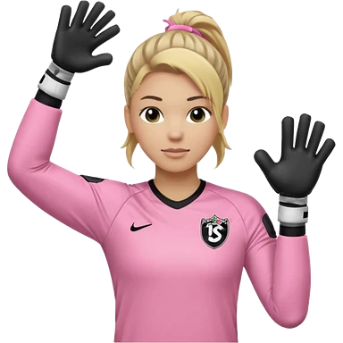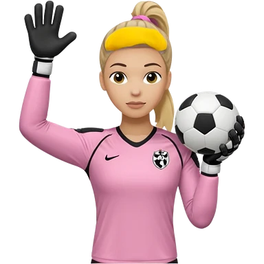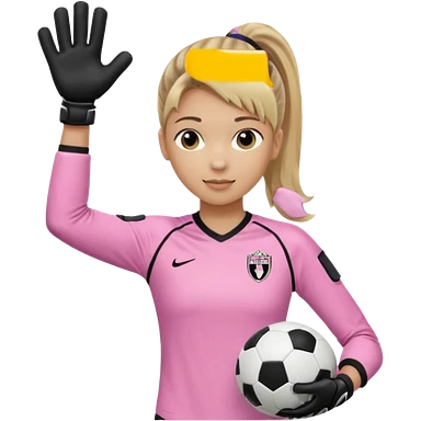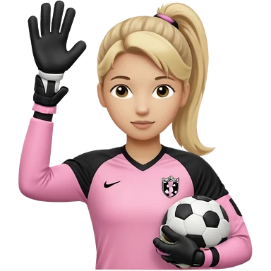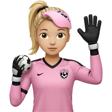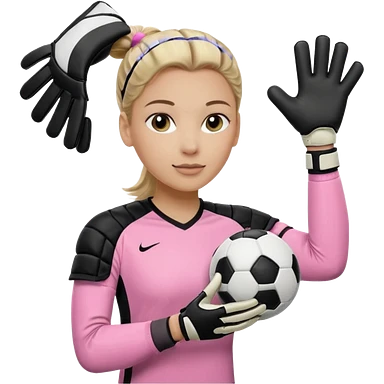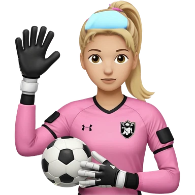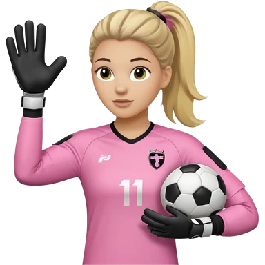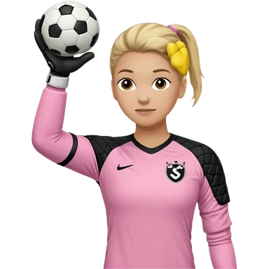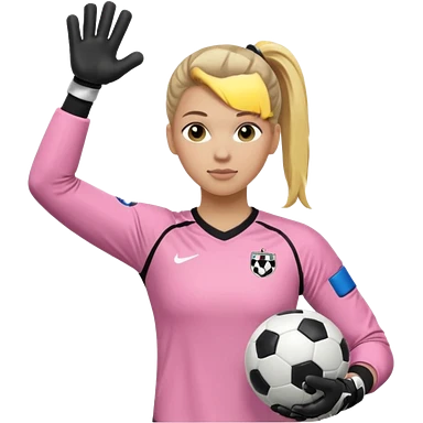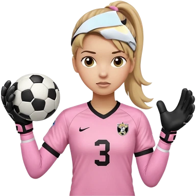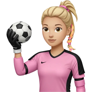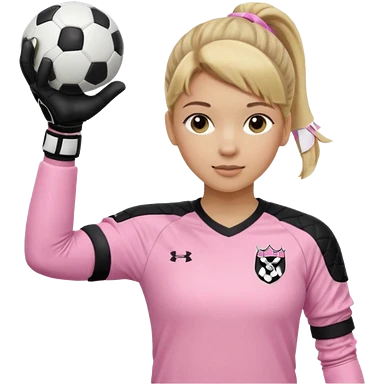 Make a dirty blonde football goalkeeper with goalkeeper gloves on. light skinned and wearing a light pink football kit. Wearing one ponytail on back of head. Make it without the whole body. With full sleeves. No RUGBY BALl. BLACK AND WHITE BALL. Holding the ball regularly emoji