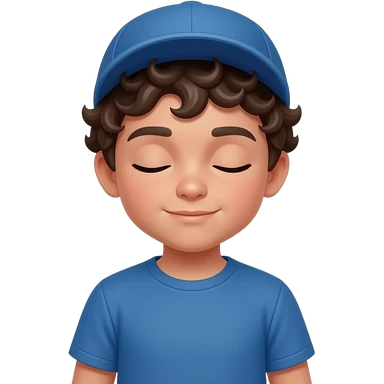 young boy with curly spice close eyes with half body close up boys weara blue t shirt and wear hat emoji