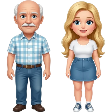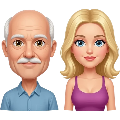 Full body Older man with skinny face balding on top with white hair and mustache with big breasted blond girl emoji