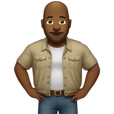 fun emoji character, shiny slicked back brown hair, handlebar mustache, light blue shirt with big puffed sleeves, cheeky deadpan look, one hand on hip, other hand forward dance pose emoji