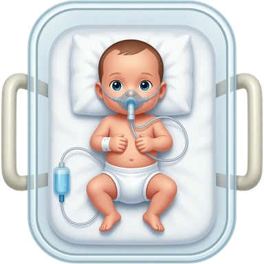 A NEONATAL BABY IN BIG BASSINET WITH VENTILATOR HAVING AN IV LINE IN HAND. emoji